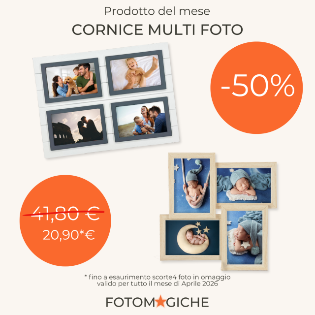 Per tutto il mese di aprile approfitta di uno sconto imperdibile! -50% su due modelli di cornici in legno multifoto (4 stampe formato 10×15 cm) Foto stampate IN OMAGGIO