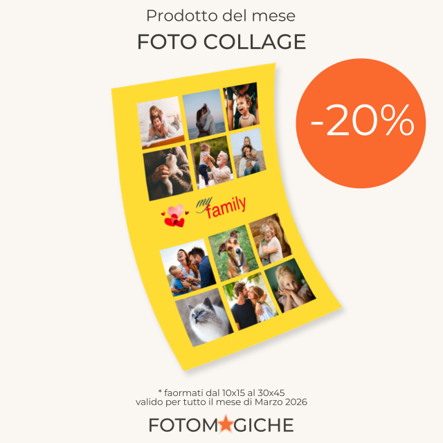 Approfitta della nostra offerta speciale di marzo 2026! Per tutto il mese, ricevi il 20% di sconto su tutti i foto collage, nei formati dal 10×15 cm al 30×45 cm. È il momento perfetto per trasformare i tuoi ricordi più belli in splendide composizioni personalizzate. Promozione valida solo dal 1° al 31 marzo 2026. Non lasciartela sfuggire!