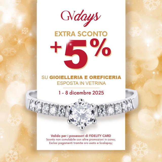 Fai brillare il tuo Natale con i Super GvDays! Vieni a trovarci in negozio per saperne di più. Promozione valida dall’1 all’8 dicembre 2025. Seguici sui nostri social per rimanere sempre aggiornato.
