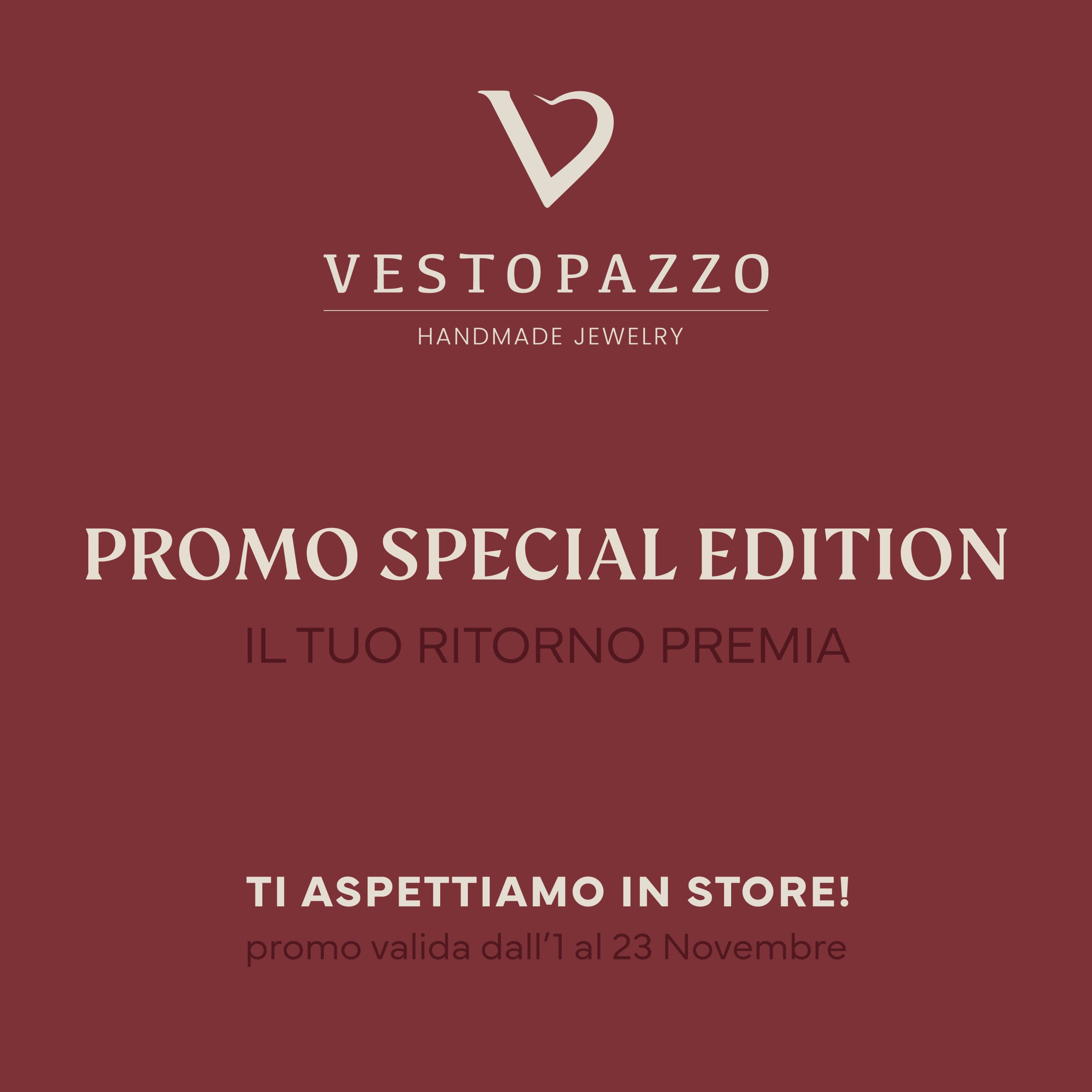 Promo Special Edition: il tuo ritorno premia! Dall’1 al 23 novembre 2025, ogni acquisto da Vestopazzo ti regala un buono per la tua prossima spesa di gioielli e accessori. Scopri le condizioni per usufruire della promozione in negozio.